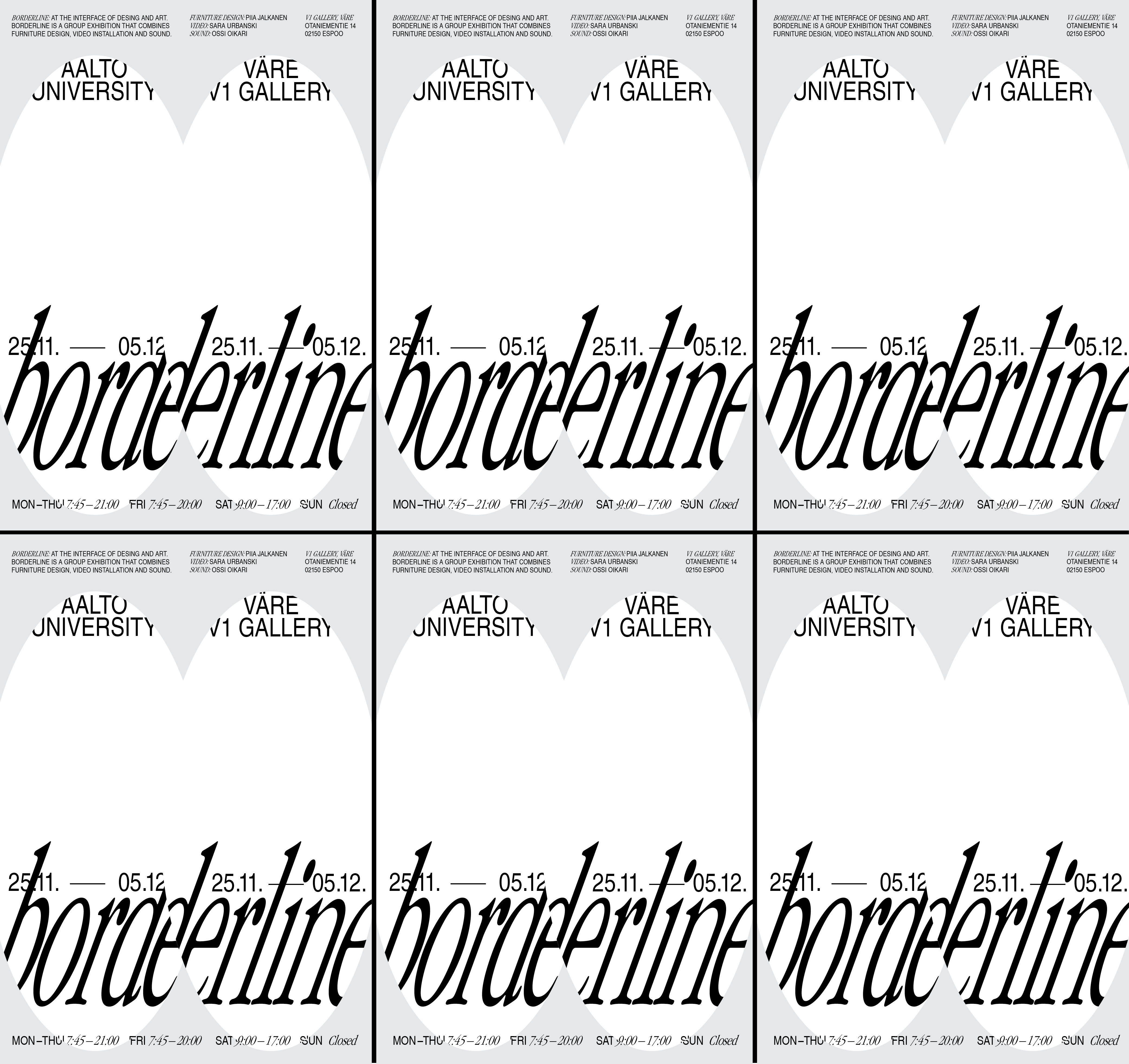 ︎︎︎ Visual identity for Borderline exhibition at Väre V1 Gallery in Aalto University. "Borderline – At the interface of design and art. Borderline is a group exhibition that combines furniture design, video installation and sound. Furniture design: Piia Jalkanen. Video: Sara Urbanski. Sound: Ossi Oikari."