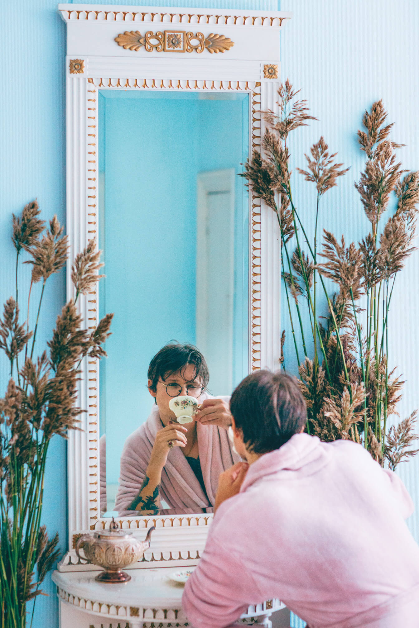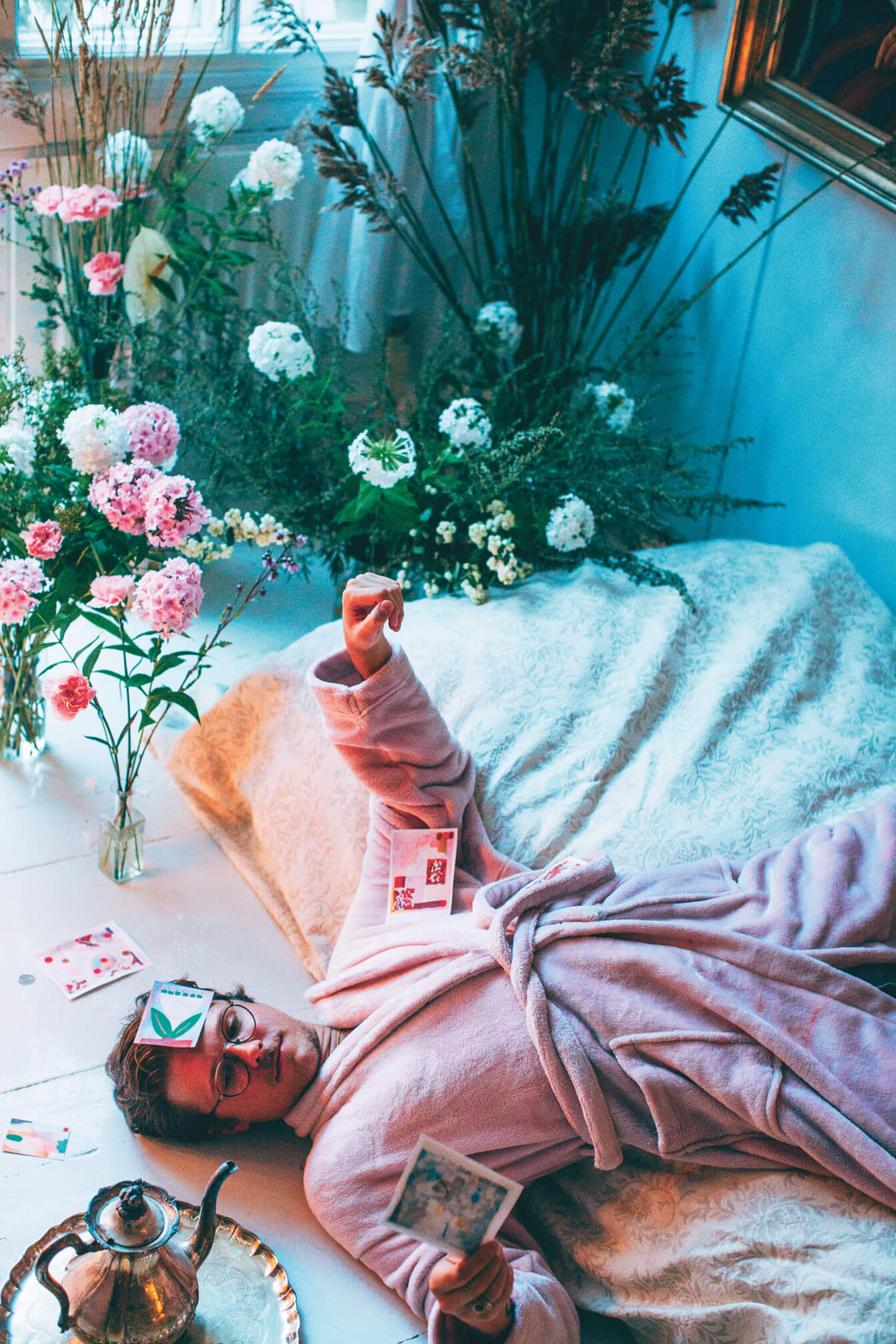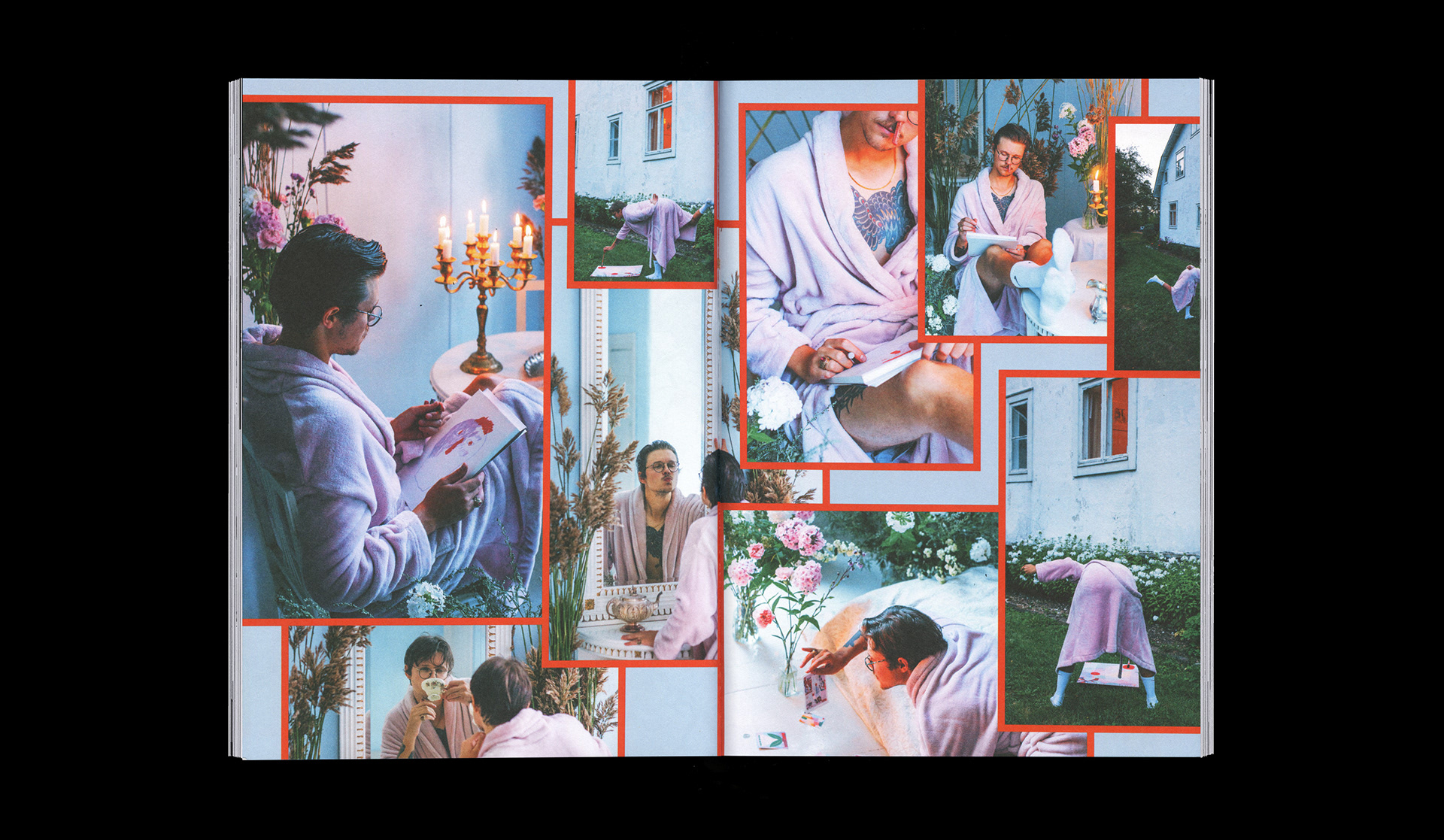 In the article Robert interviews himself, so we wanted to have fun with the narcissistic nature of the whole setup. "Robert the Lover in love with himself". His work and personality are very tongue in cheek, so it felt obvious to present that through exaggeration while also emphasizing cues to his artist name.