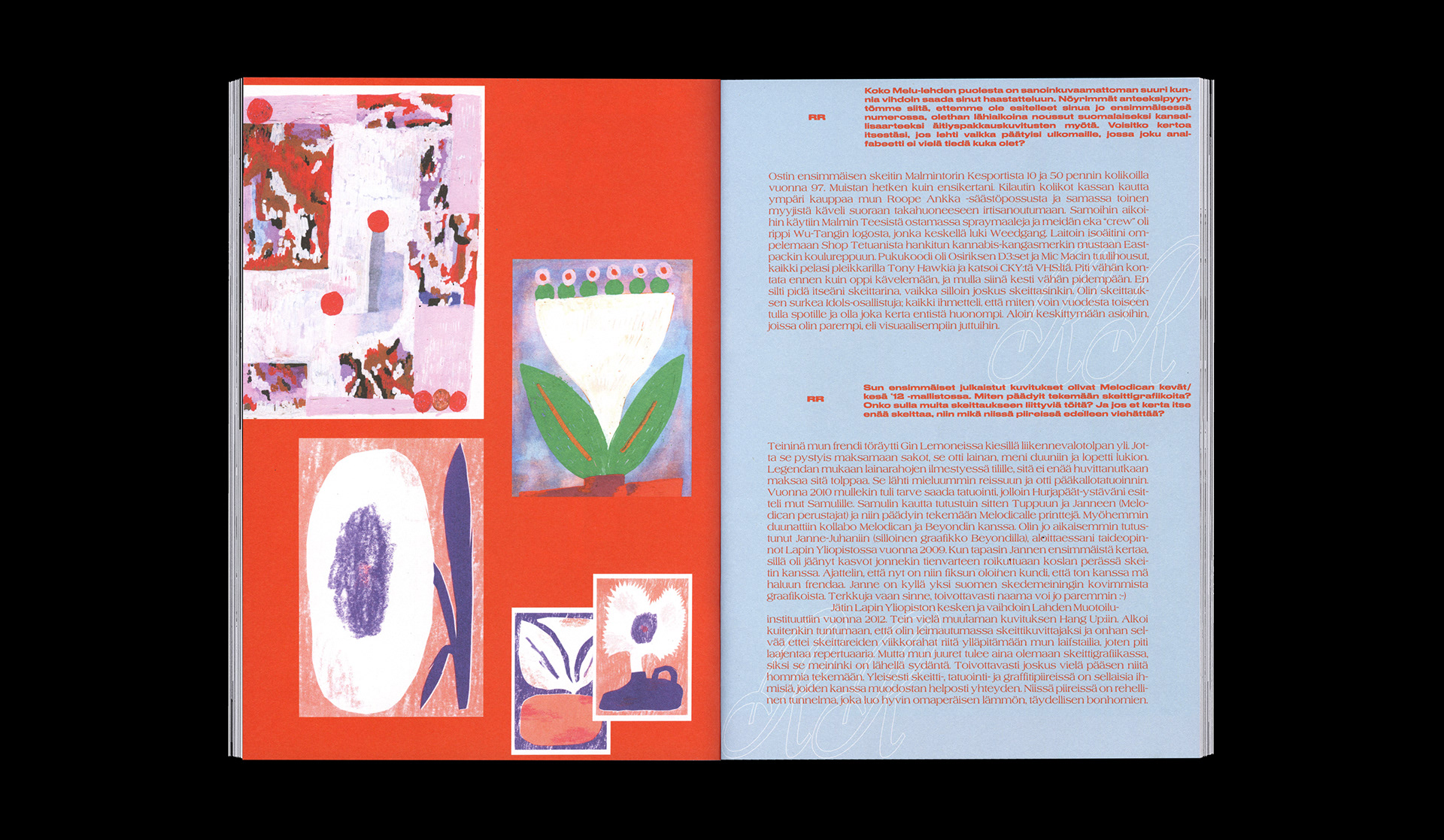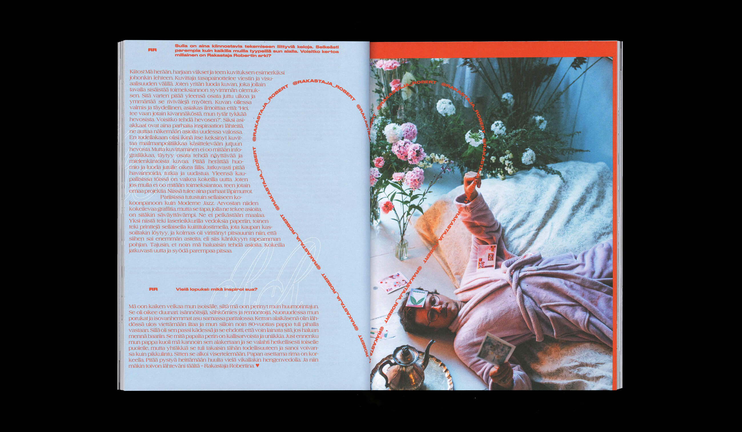 ︎︎︎ Art direction and layout for an article in Melu Magazine about illustrator and visual artist Rakastaja Robert (Robert the Lover). The concept is "a day in the life", a sort of a satire of the clichés of artist life.